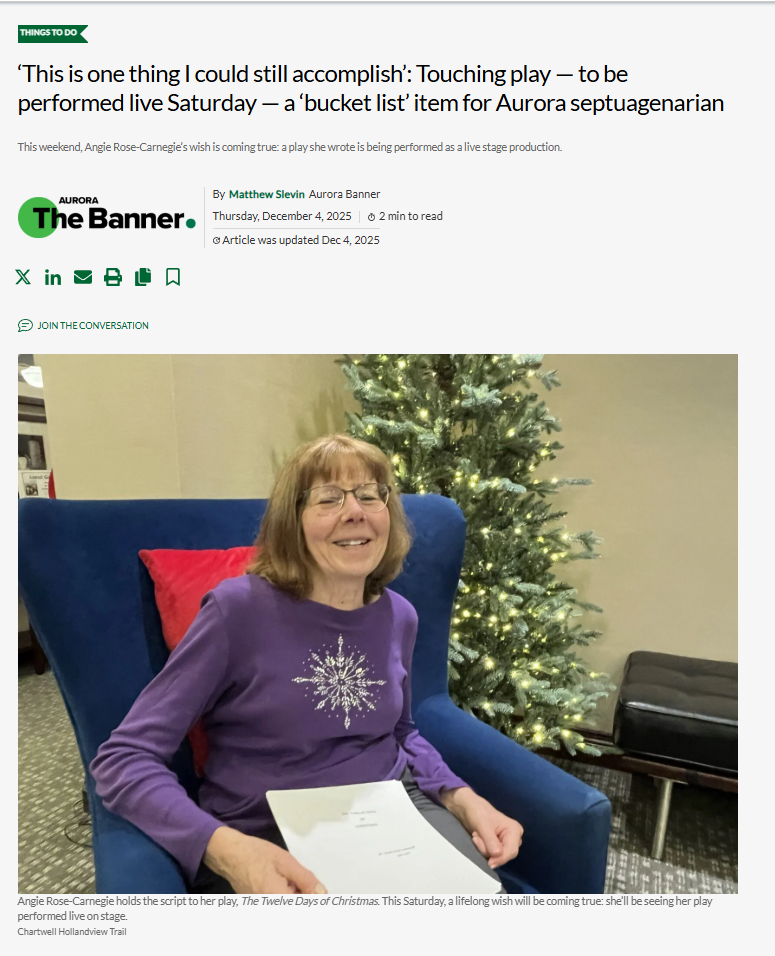 Seventy-year-old Angie Carnegie’s dream came true when her original play was performed live for the first time. My pitch resulted in a feature story in Aurora Today and The Banner as well as a visit from the Mayor of Aurora.
