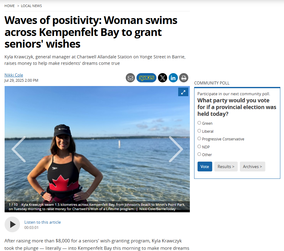 Pitched Kyla Krawczyk’s fundraiser swim in support of Chartwell Wish of a Lifetime, earning regional media coverage that boosted awareness and donations for the campaign.